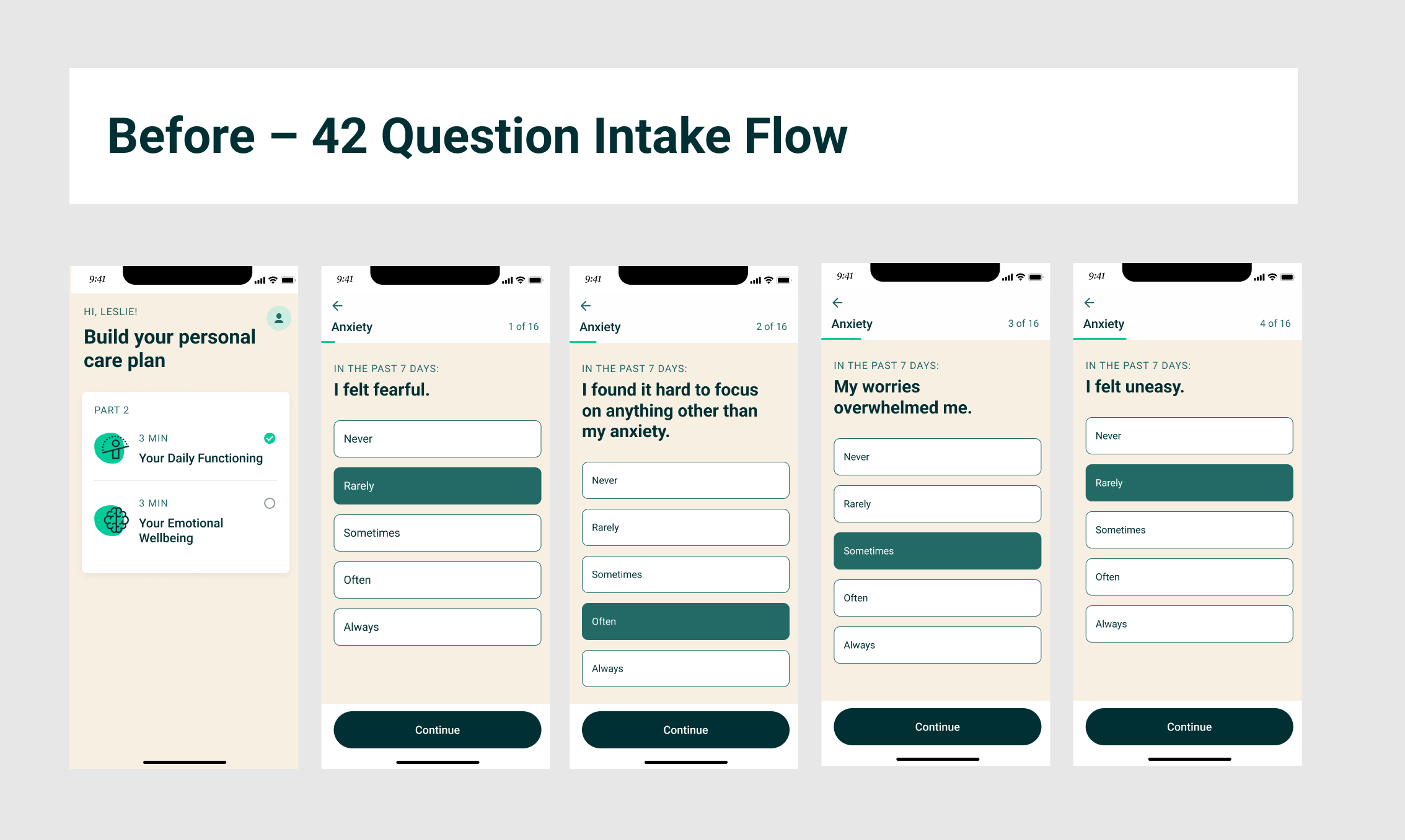 Large drop off in onboarding, through user data and conducting interviews, users had a question burden from a long intake process.